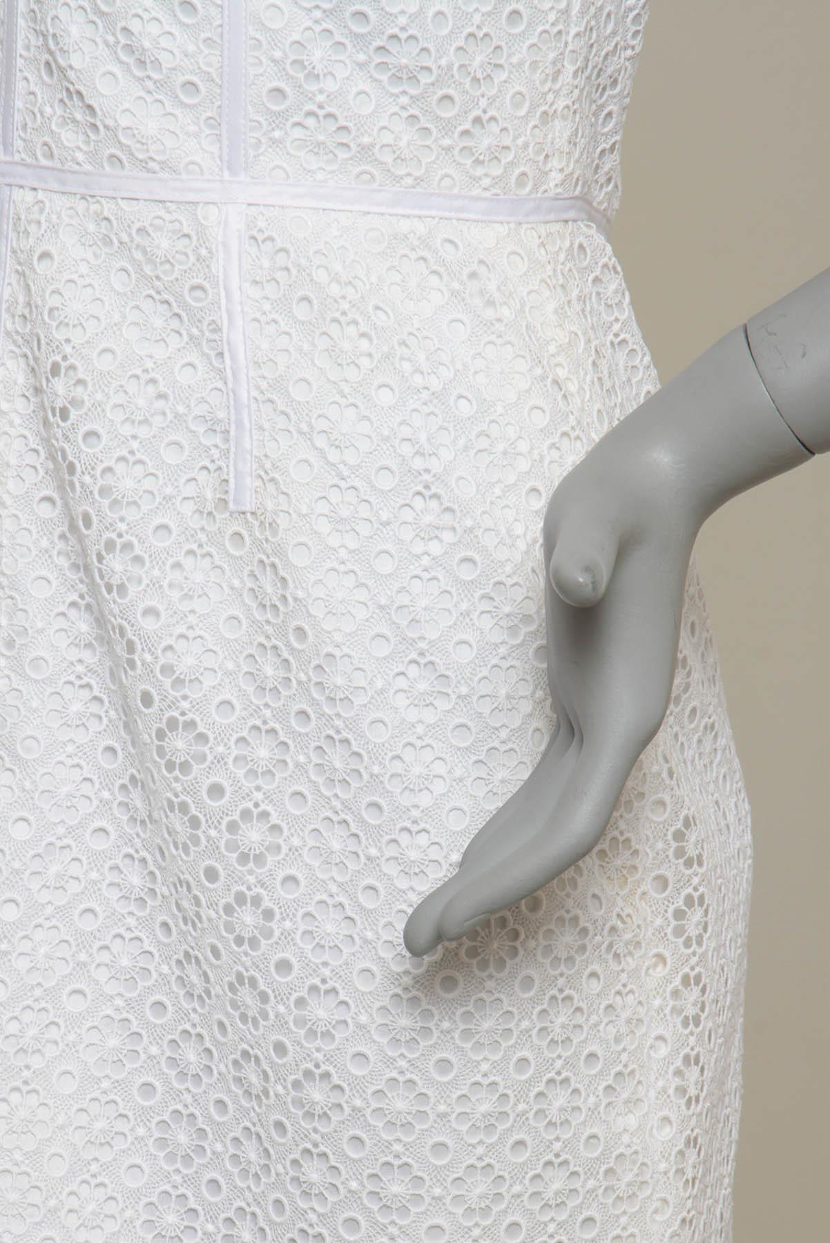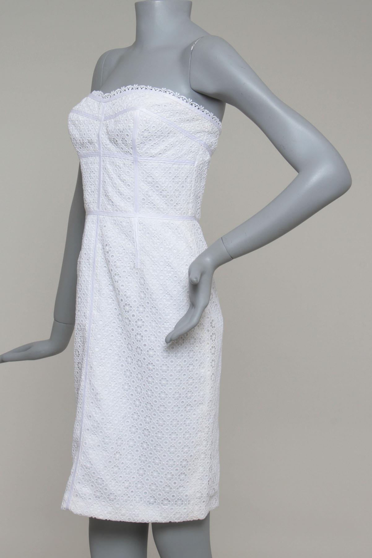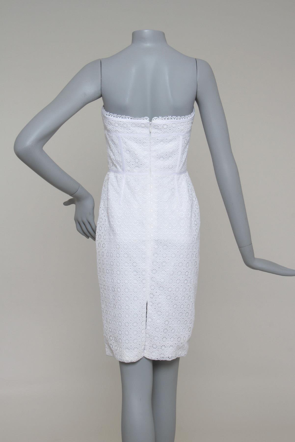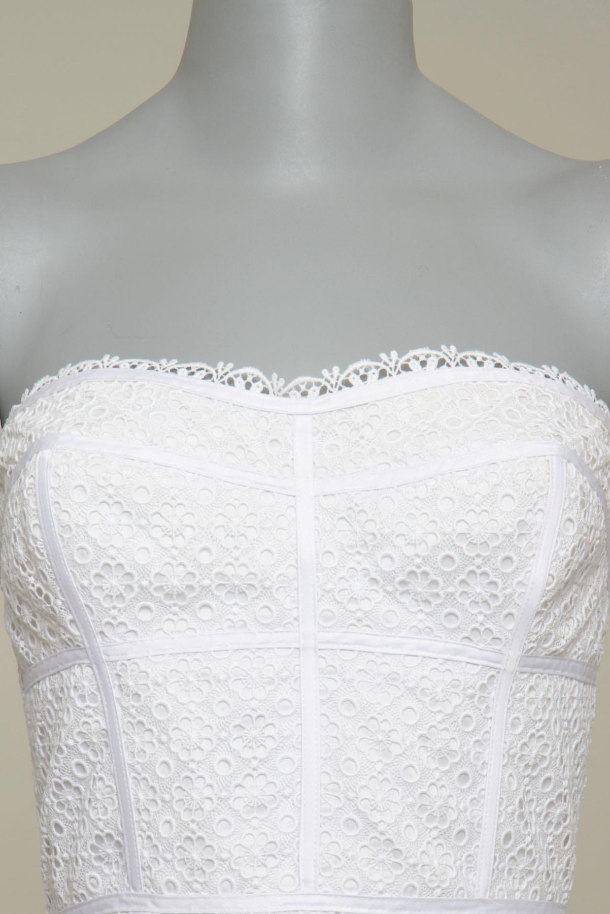 - Vestido em renda- Branco- Tramado decorativo de temática floral- Modelagem reta ajustada ao corpo- Decote tomara que caia com barbatanas de sustentação- Recortes decorativos- Comprimento curto- Fechamento posterior por zíper invisível.