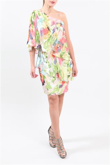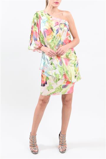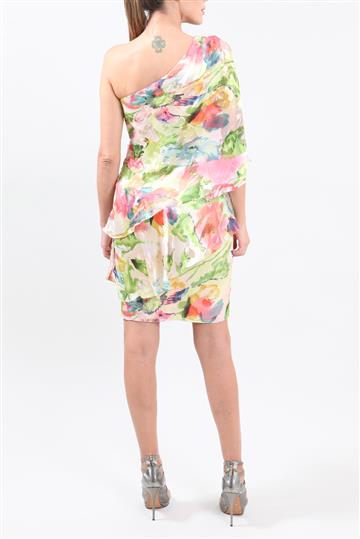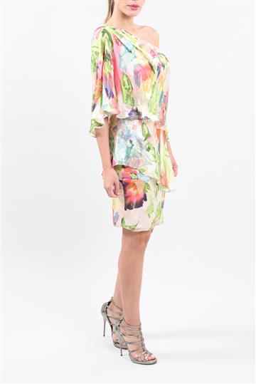 - Vestido em tecido acetinado encorpado com sobreposição de tecido leve e fluido