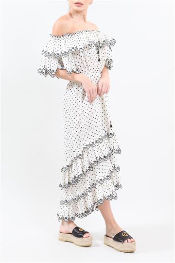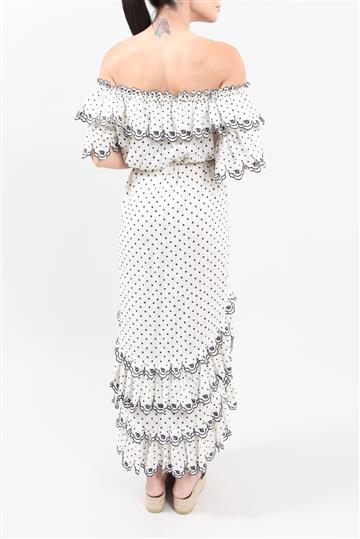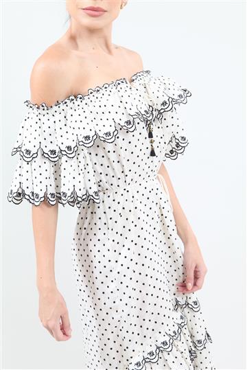 - Babados bordados aplicados ao redor de todo o decote