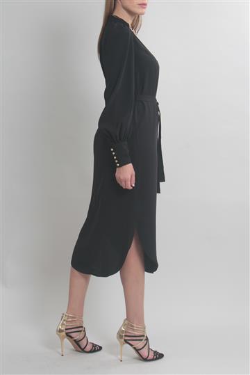 - Decote em 'V' com gola padre superior e corrente decorativa
